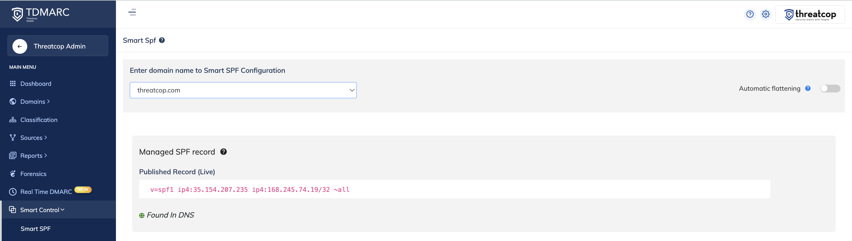 TDMARC’s Automatic Flattening feature automatically flattens your SPF record, eliminating any effort on your part. You can simply opt for the Automatic Flattening on the TDMARC dashboard for always returning public DNS queries with a flattened SPF record. It also keeps it updated with modified IPs periodically.