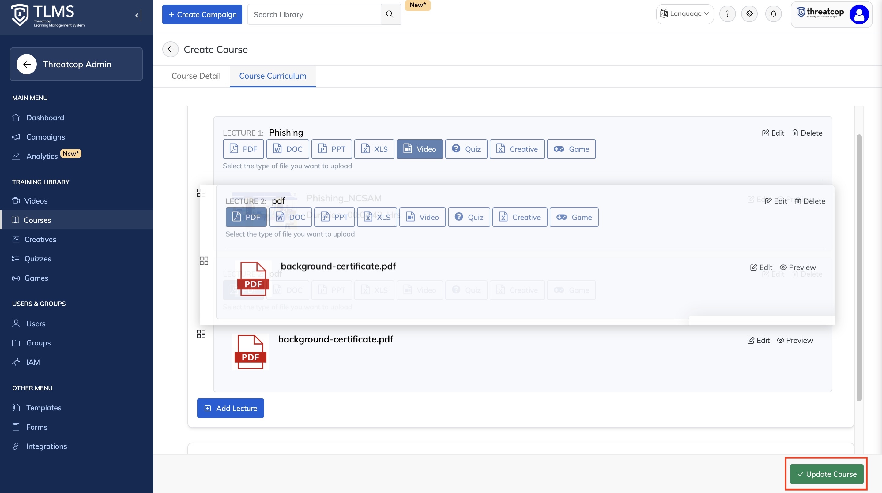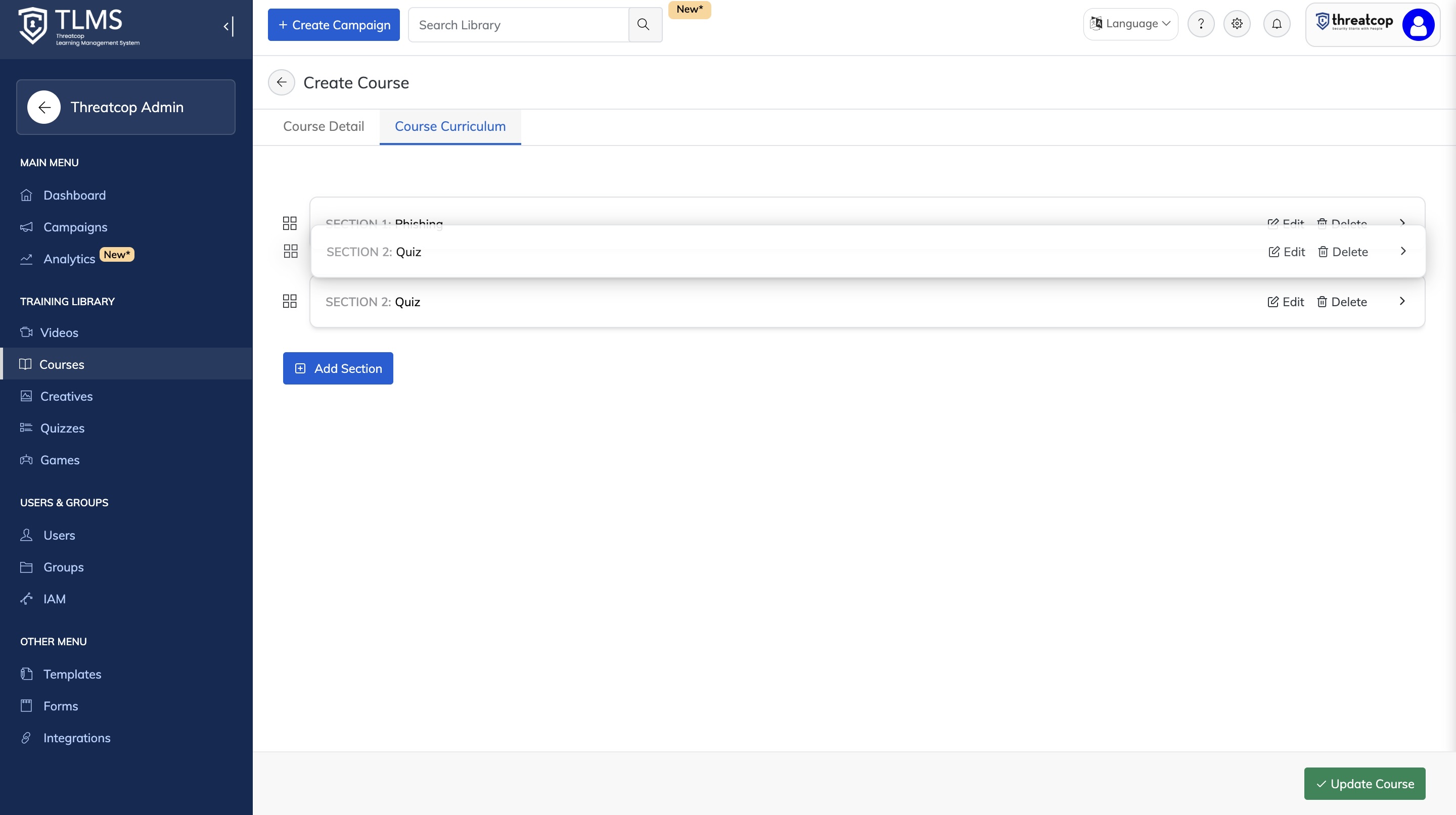 - Use the Update Course option to save any modifications.