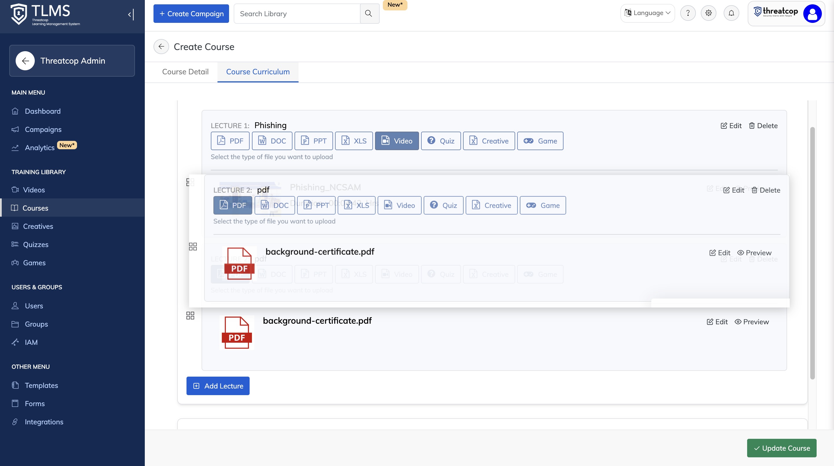The Draggable Curriculum feature allows administrators to edit, reorder, and manage course content by dragging lectures, quizzes, and games within the course structure. This makes curriculum management flexible and intuitive.