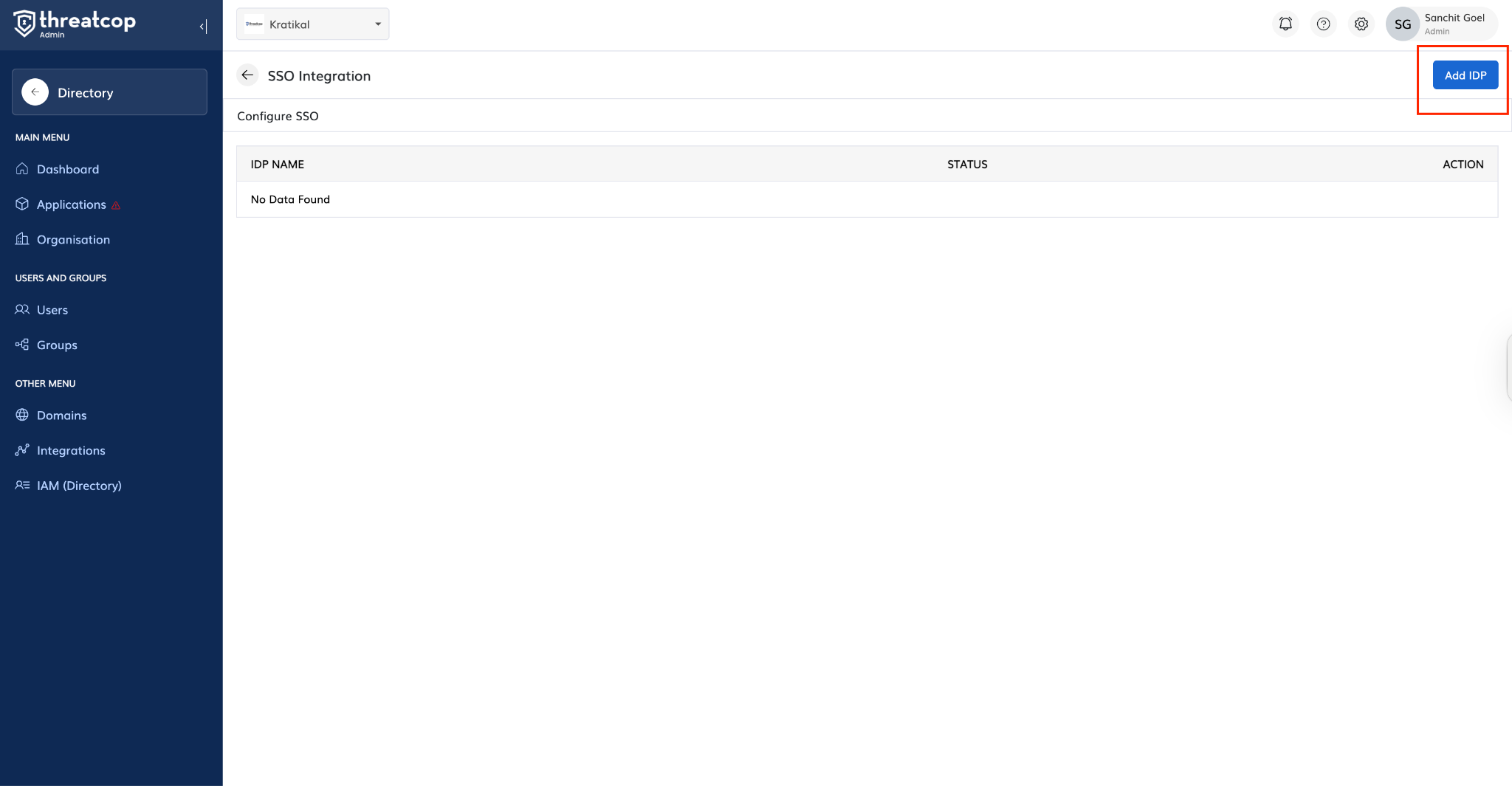 - On the top-right corner (just below the user profile), click on “Add IDP”.